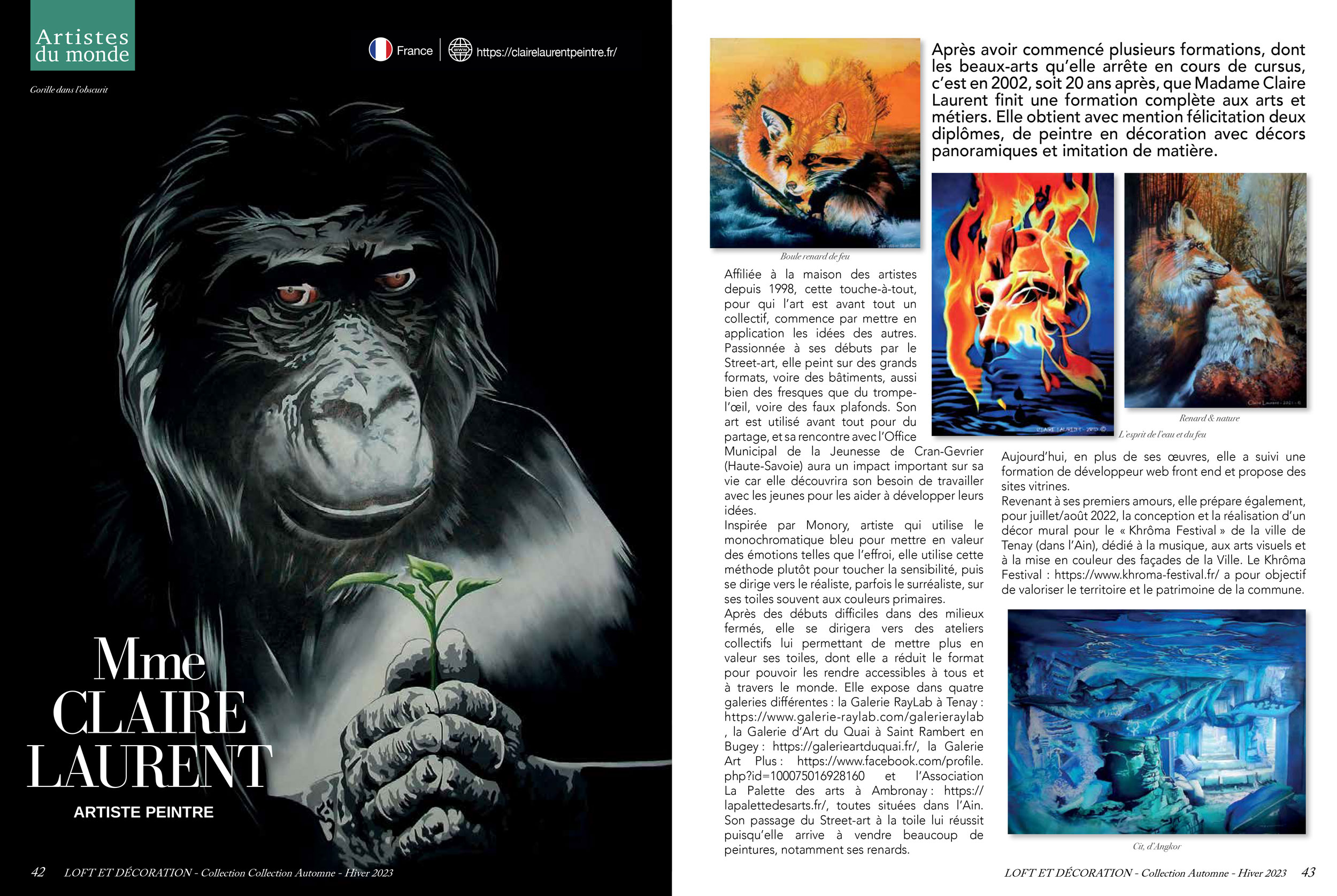Claire Laurent exprime son talent en format géant sur les murs des bâtiments. Fresque monumentale, trompe-l’oeil architectural, faux plafond, fausse matière, cette ancienne élève des Arts Déco a souvent travaillé sur commande pour mettre en valeur les idées des autres; puis ce sont ces idées qu’elle a souhaité exprimer sur toile, dans une veine réaliste parfois surréaliste.
